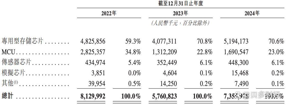 招股书亦显示,兆易创新的收入主要来自专用型存储芯片、MCU。报告期内,该公司的专用型存储芯片收入分别约为48.26亿元、40.77亿元和51.94亿元,占其总收入的比例分别为59.3%、70.8%和70.6%。