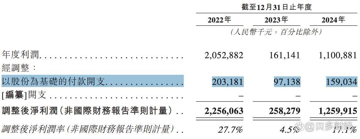 按非国际财务报告准则计量,兆易创新的调整后净利润分别约为22.56亿元、2.58亿元和12.60亿元。与之对应的是,兆易创新2022年、2023年和2024年分别产生以股份为基础的付款开支约2.03亿元、9713.8万元和1.59亿元。