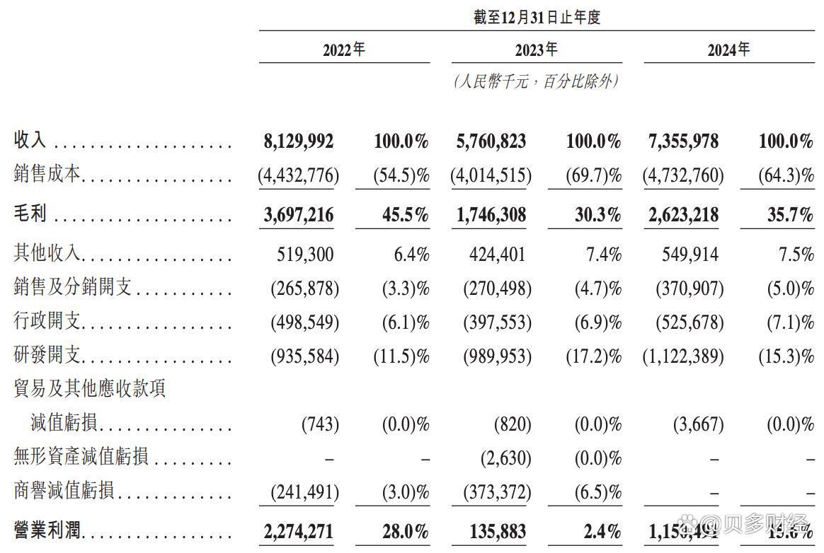 2022年、2023年和2024年,兆易创新的营收分别约为人民币81.30亿元、57.61亿元和73.56亿元,毛利分别约为36.97亿元、17.46亿元和26.23亿元,净利润分别约为20.53亿元、1.61亿元和11.01亿元。