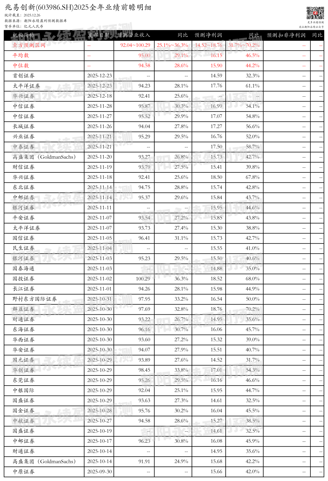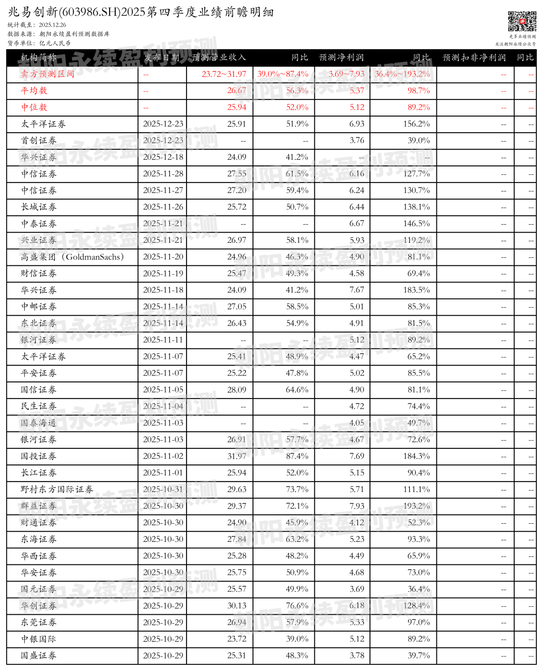 截至2025年12月26日,根据朝阳永续季度业绩前瞻数据: