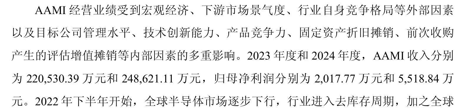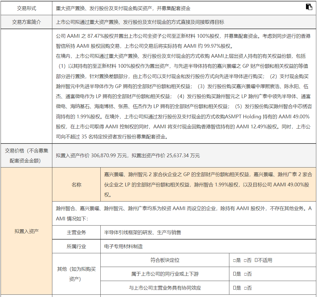 相关媒体报道称,资料显示,目标公司 AAMI 前身为港股上市公司ASMPT 的物料业务分部,于2020年底成立为独立合资公司,从事半导体引线框架的设计、研发、生产与销售,产品广泛应用于各类半导体产品。