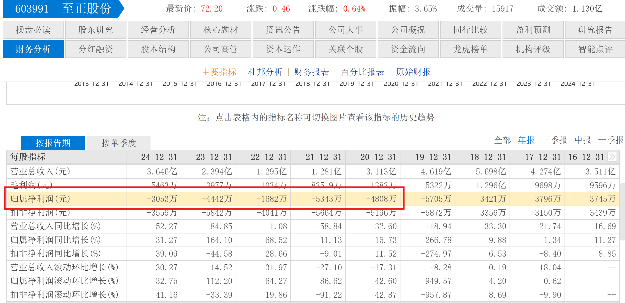 值得关注的是,从2019年至2024年,至正股份的净利润均为负值。2024年,该公司营收3.65亿元,归属母公司净利润亏损0.31亿元。