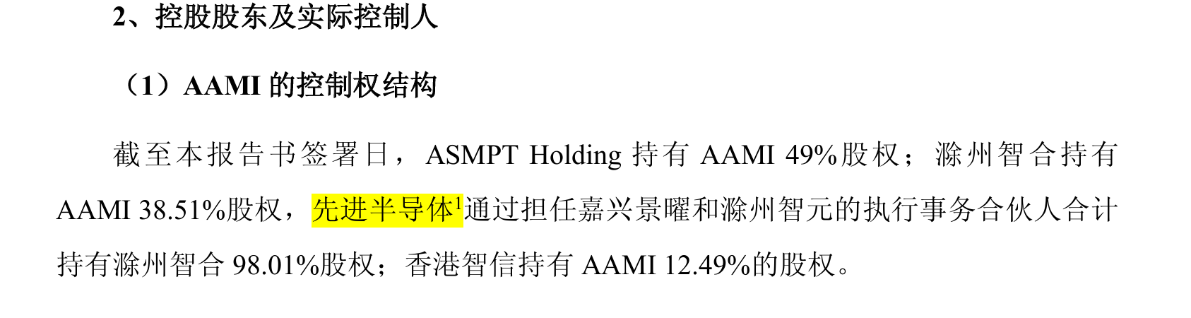 截至并购报告书签署日,ASMPT Holding 持有 AAMI 49%股权;滁州智合持有AAMI 38.51%股权,先进半导体通过担任嘉兴景曜和滁州智元的执行事务合伙人合计持有滁州智合 98.01%股权;香港智信持有 AAMI 12.49%的股权。