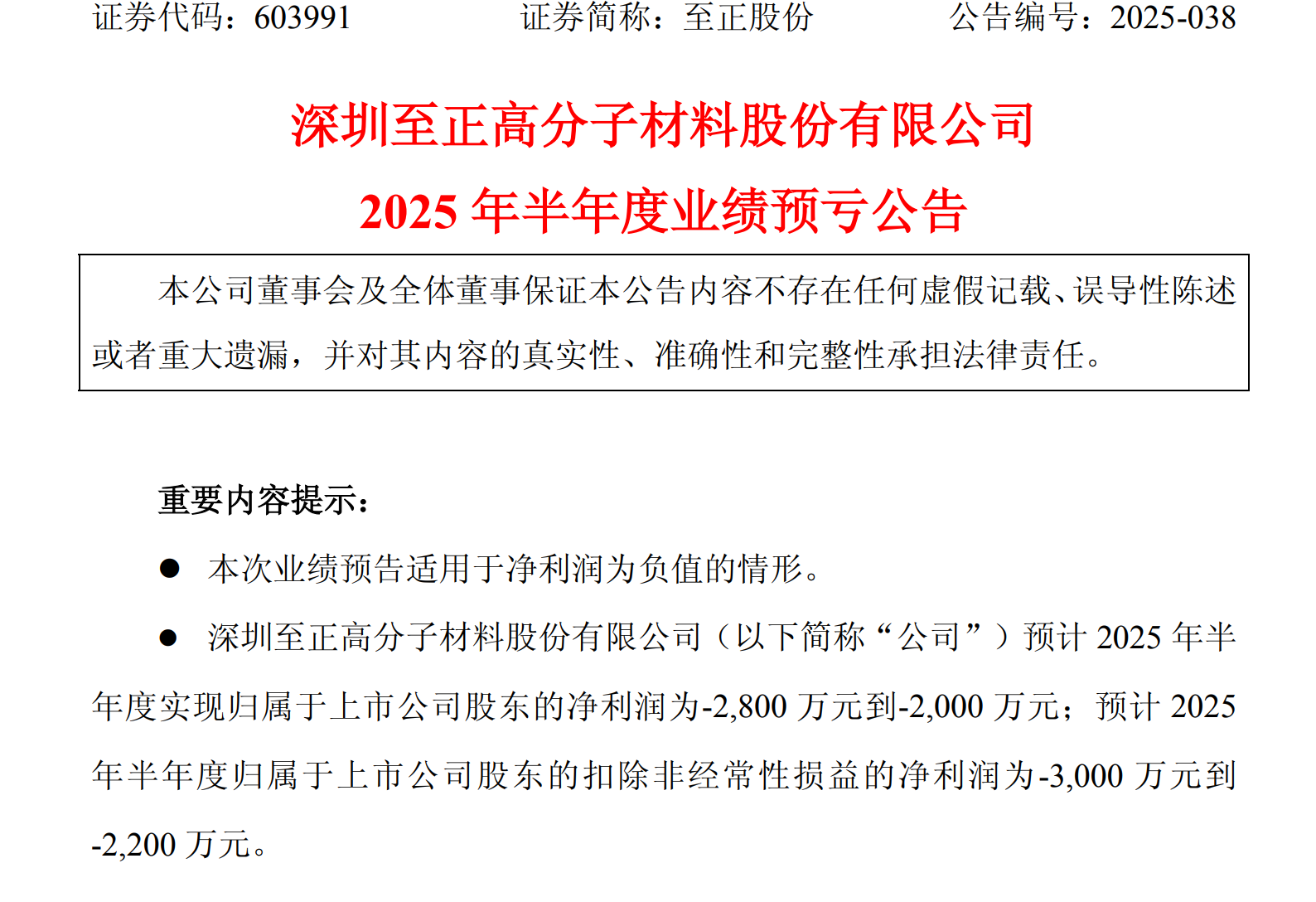 至正股份预计2025年上半年度实现归属于上市公司股东的净利润将继续亏损,预计实现归属于上市公司股东的净利润为-2800万元到-2000万元。