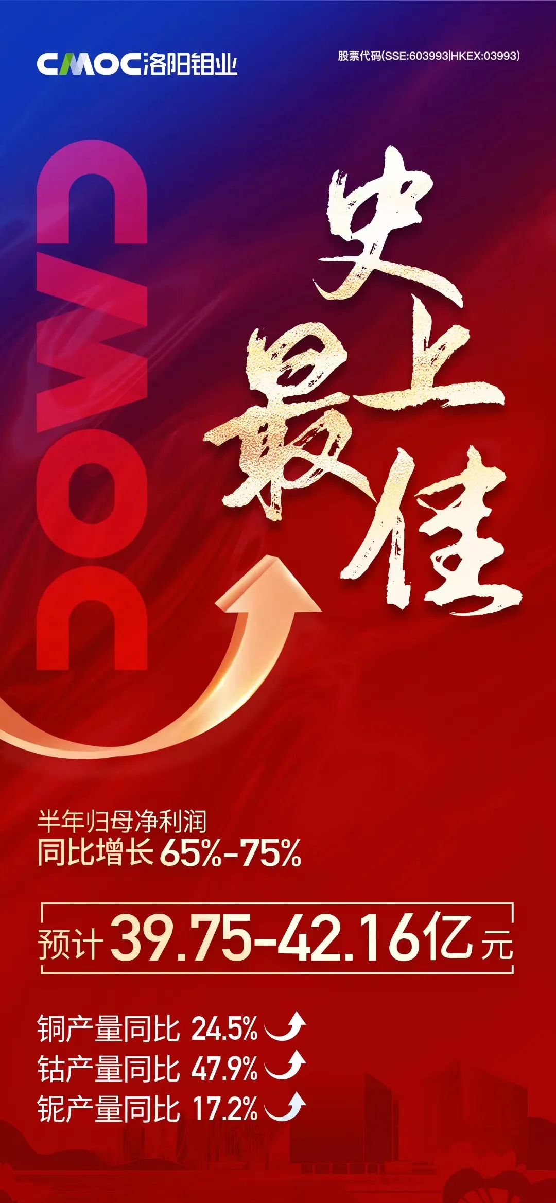 7月14日晚间,洛阳钼业发布业绩预增公告,预计2022年上半年实现归母净利润约为39.75亿元到42.16亿元,与上年同期相比,将增加15.66亿元到18.07亿元,同比增加65%到75%。这将是公司史上最佳半年度业绩。