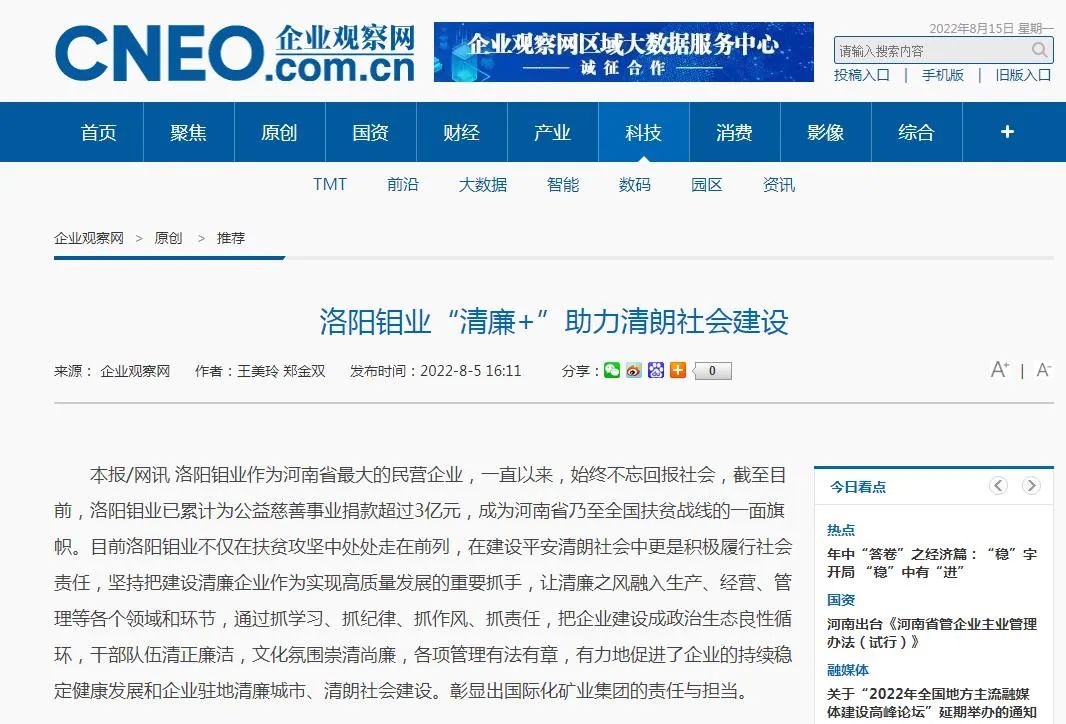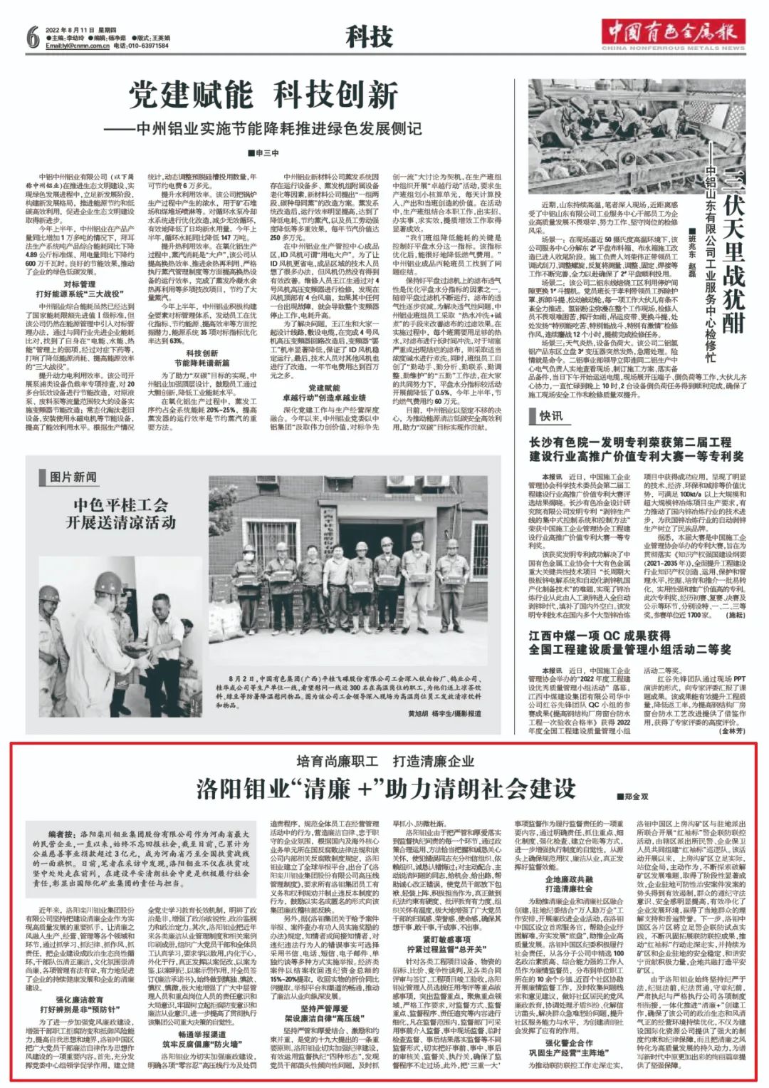连年来,洛阳钼业坚持把建设清廉企业作为实现高质量发展的重要抓手,让清廉之风融入生产、经营、管理等各个领域和环节,通过抓学习、抓纪律、抓作风、抓责任,把企业建设成政治生态良性循环,干部队伍清正廉洁,文化氛围崇清尚廉,各项管理有法有章,有力地促进了企业的持续稳定健康发展和企业驻地清廉城市、清朗社会建设。
