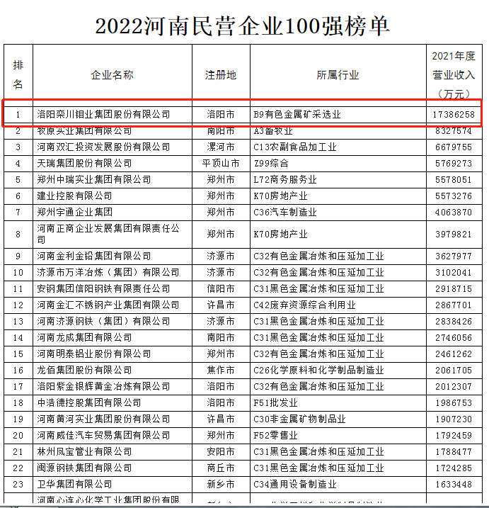 近日,河南省工商联公布2022河南民营企业100强系列榜单,洛阳钼业以1738.63亿元的营业收入规模,位居“2022河南省民营企业100强”榜首。