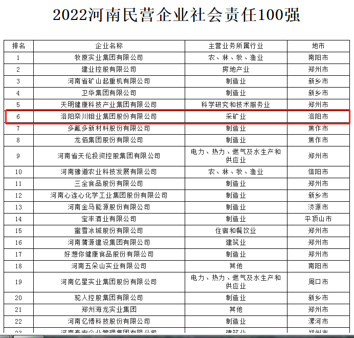 会上同时发布2022河南民营企业社会责任100强榜单,洛阳钼业位列第6名。