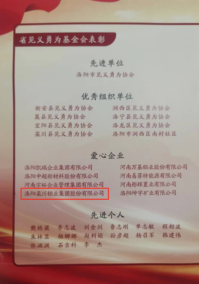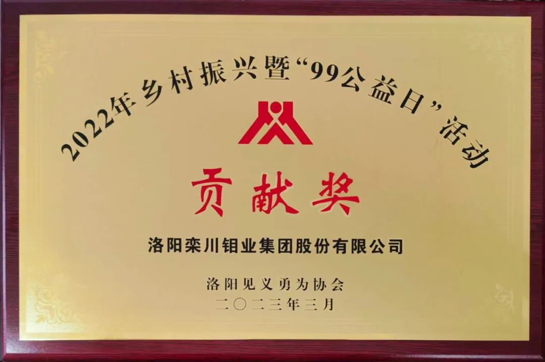 好事接二连三,荣誉接踵而至。近日,省、市见义勇为工作总结暨“99公益日”表彰会相继召开。会上,表彰了一批2022年“乡村振兴河南专场暨99公益日”活动先进集体和个人。洛阳钼业分别荣获河南省见义勇为爱心企业、洛阳市见义勇为贡献奖、洛阳市见义勇为优秀组织单位,以及先进个人等多项荣誉。