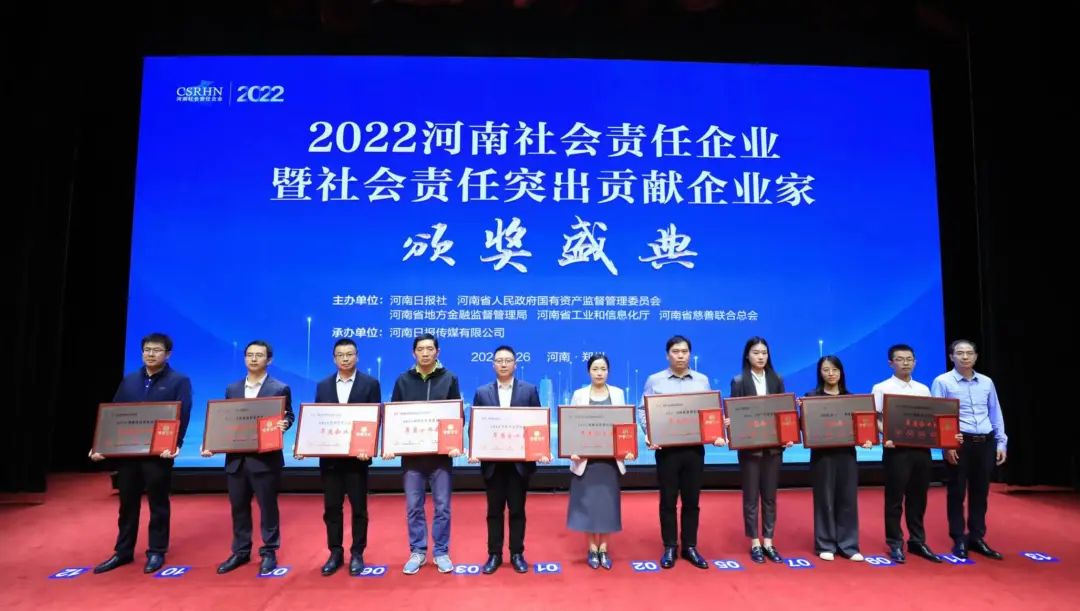 2023年5月26日下午,由河南日报社、河南省政府国资委、河南省地方金融监督管理局、河南省工信厅、河南省慈善联合总会共同主办的2022“河南社会责任企业”颁奖盛典在郑州隆重举行。
