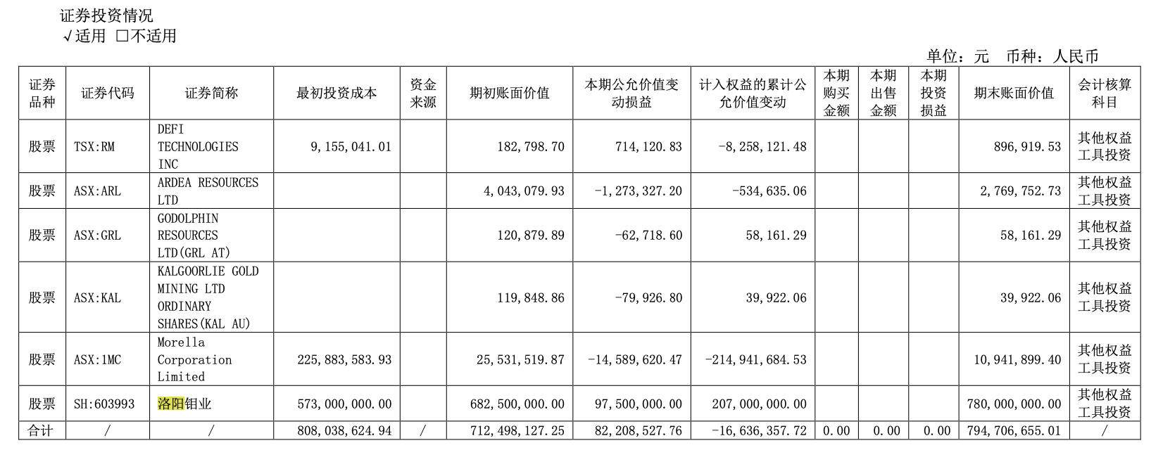 2023年年报显示,杉杉股份持股洛阳钼业的初始成本为5.73亿元。截至二季度末,杉杉股份大幅抛售近一半股票,这期间洛阳钼业的股价正处于8元-10元/股的高位,但具体所产生的投资损益仍需要等待今年上半年半年报披露。