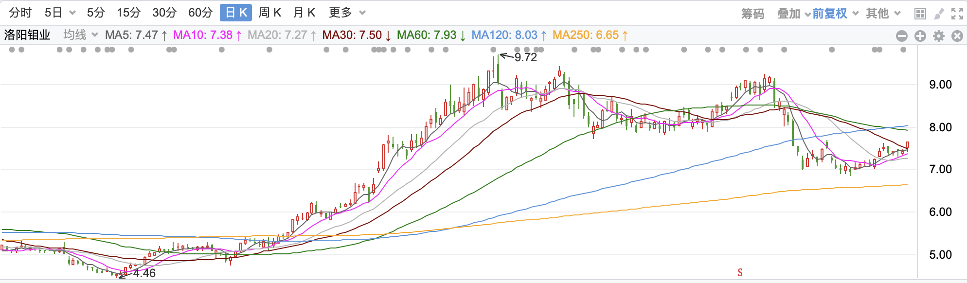 二级市场来看,今年上半年,洛阳钼业的股价保持先上行再震荡波动态势。由年初5.14元/股涨至4月19日的9.33元/股,涨幅超80%。随后公司股价震荡下行,其中7月12日公司超预期的半年业绩预告披露之后,股价不涨反跌。