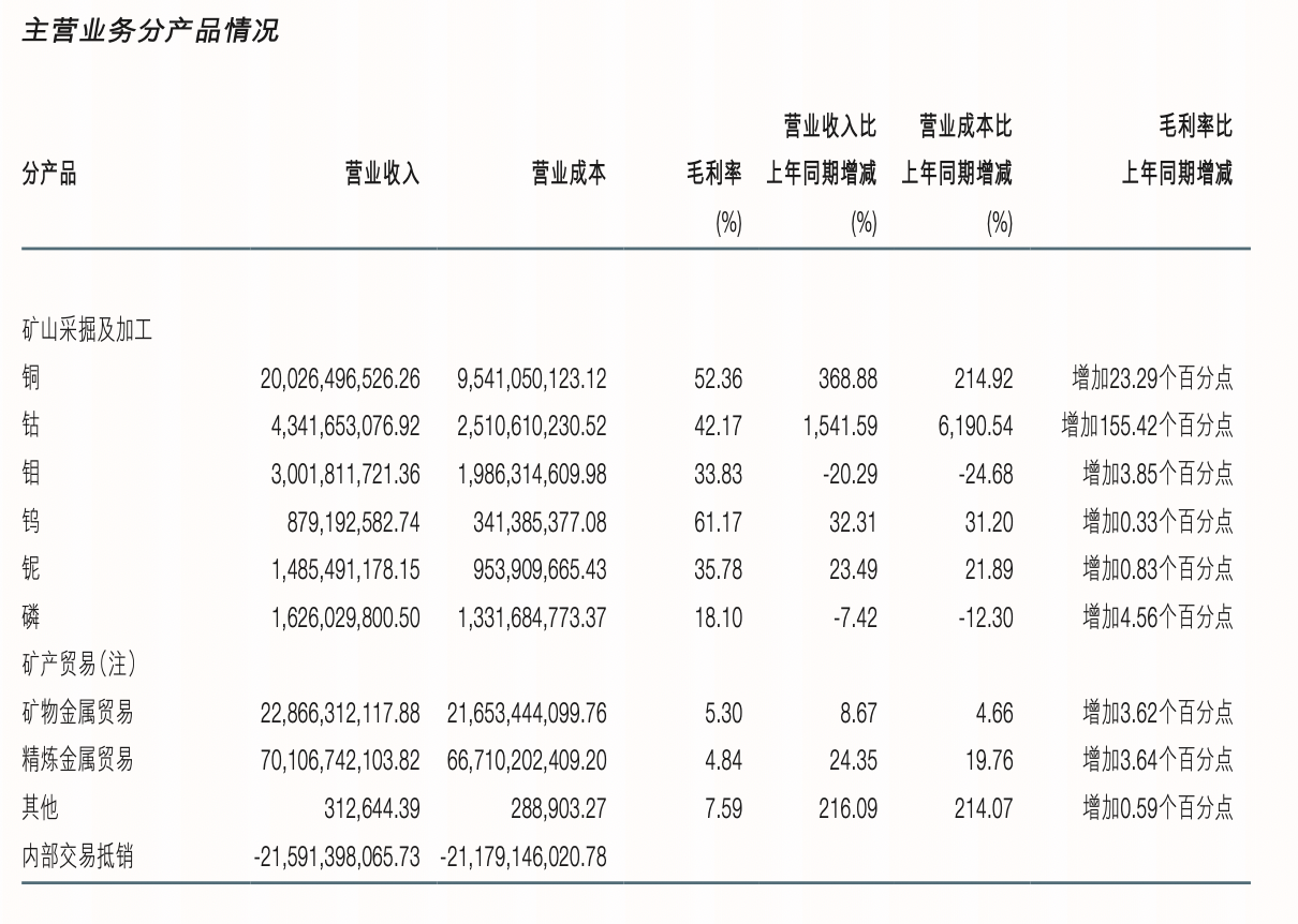 洛阳钼业主营业务包括矿山采掘及加工业务和矿产贸易业务两大板块,主要产品包括铜、钴、钼、钨、铌、磷肥等,主要矿区包括刚果(金)铜钴、中国钼钨、巴西铌磷三大矿区,贸易则由子公司IXM来经营。