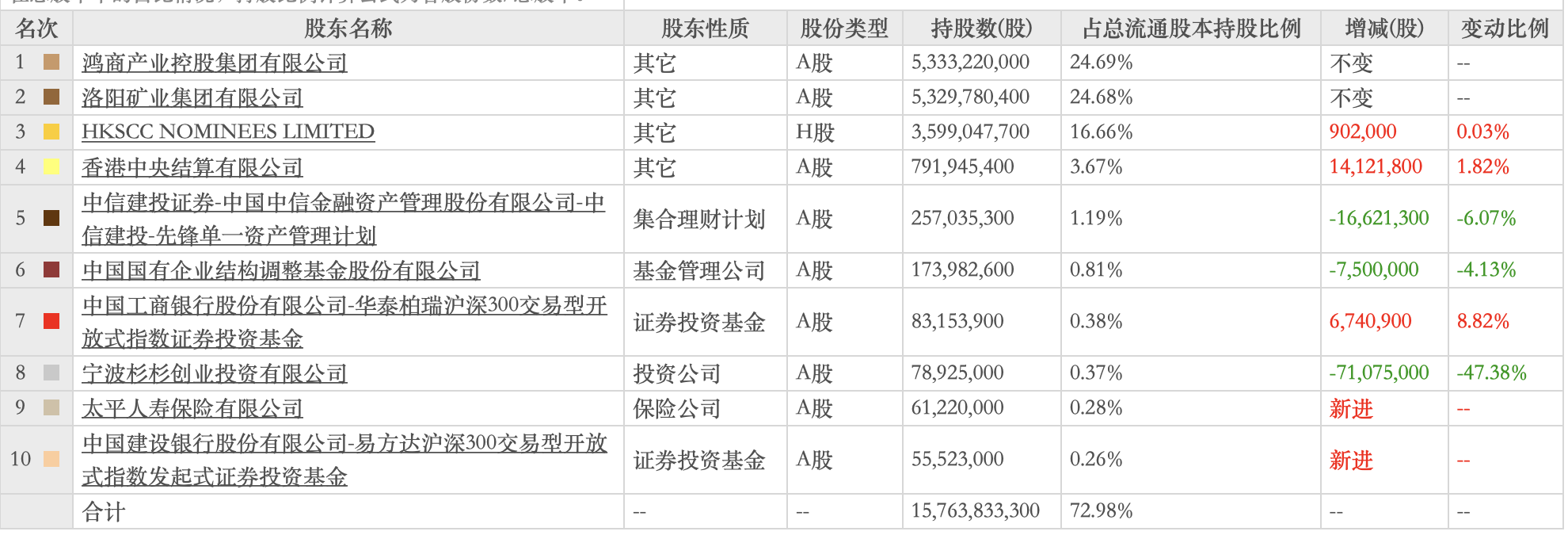 截至2024年6月30日,北向资金代表香港中央结算有限公司小幅增持洛阳钼业,华泰柏瑞沪深300交易型基金继续增持比例8.82%。同时太平人寿保险有限公司、易方达沪深300交易型基金进入前十大流通股东之列。