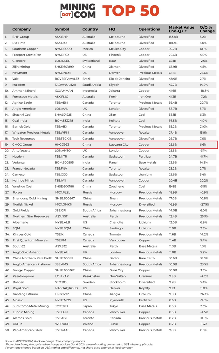 上述榜单由MINING.COM根据截止到今年第三季度的市值来统计,50家上榜企业的总市值达到1.51万亿美元,较年初上涨8%。其中,洛阳钼业9月30日收盘价为8.70元/股,市值超1800亿元人民币。
