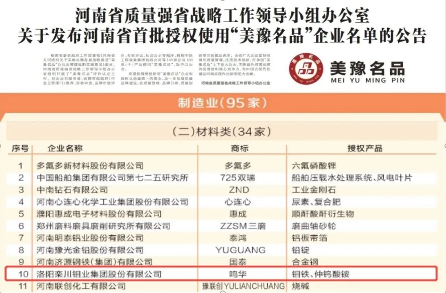 1月9日,河南省首批“美豫名品”发布活动在郑州举行,洛阳钼业凭借鸣华牌钼铁、仲钨酸铵成功入选河南省首批授权使用“美豫名品”企业名单,全省共128家企业160类(个)产品获得首批授权,洛阳钼业作为34家材料类企业之一成功入选,排名前十。