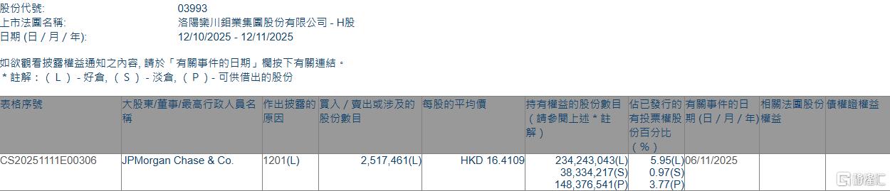 格隆汇11月12日丨根据联交所最新权益披露资料显示,2025年11月6日,洛阳钼业(03993.HK)遭JPMorgan Chase & Co.以每股均价16.4109港元减持好仓251.75万股,涉资约4131.38万港元。