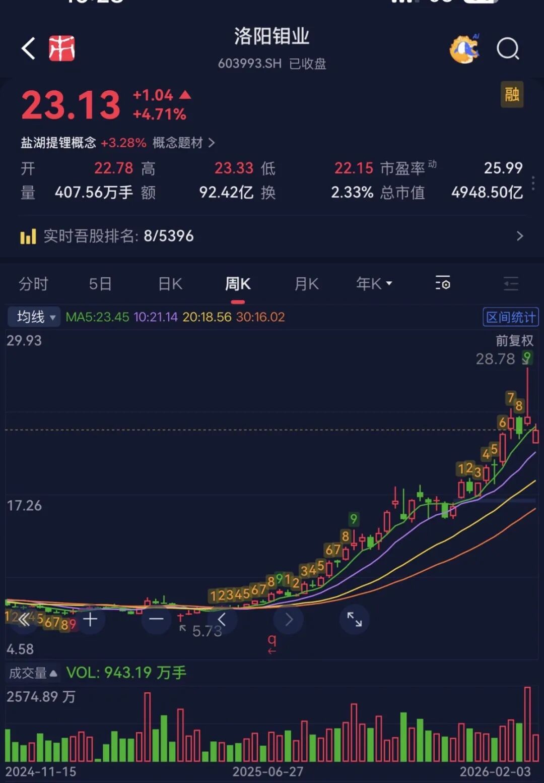 截止2026年2月3日,洛阳钼业的市值已经逼近5000亿,市场给的估值也很高,静态25倍。