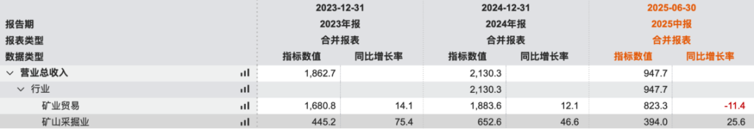 当然收入需拆分矿产采掘和矿产贸易这两块更准确,根据2025年上半年数据来看,营业收入的同比下降7.8%,主要是矿产贸易收入(毛利率很低)下滑了11.4%,实际上毛利率更高更重要的矿产采掘收入是增长了25.6%的。