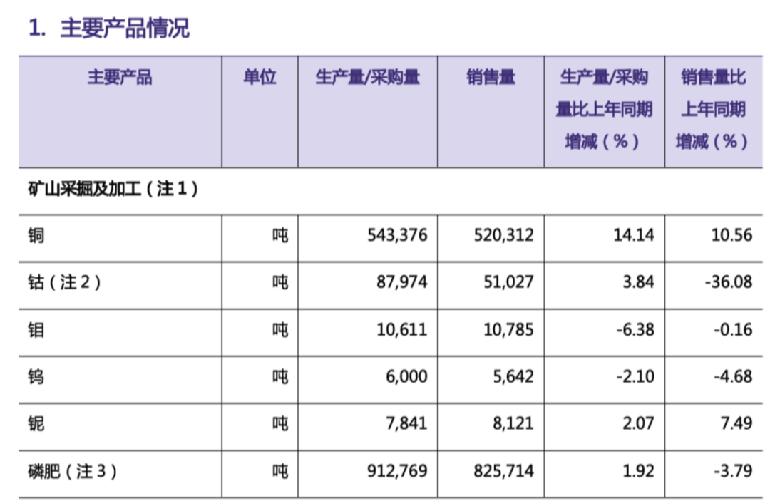 第一点产量方面,上半年公司各个产品(铜/钴/钼/钨/铌/磷肥)均超额完成2024年年度的指引计划。