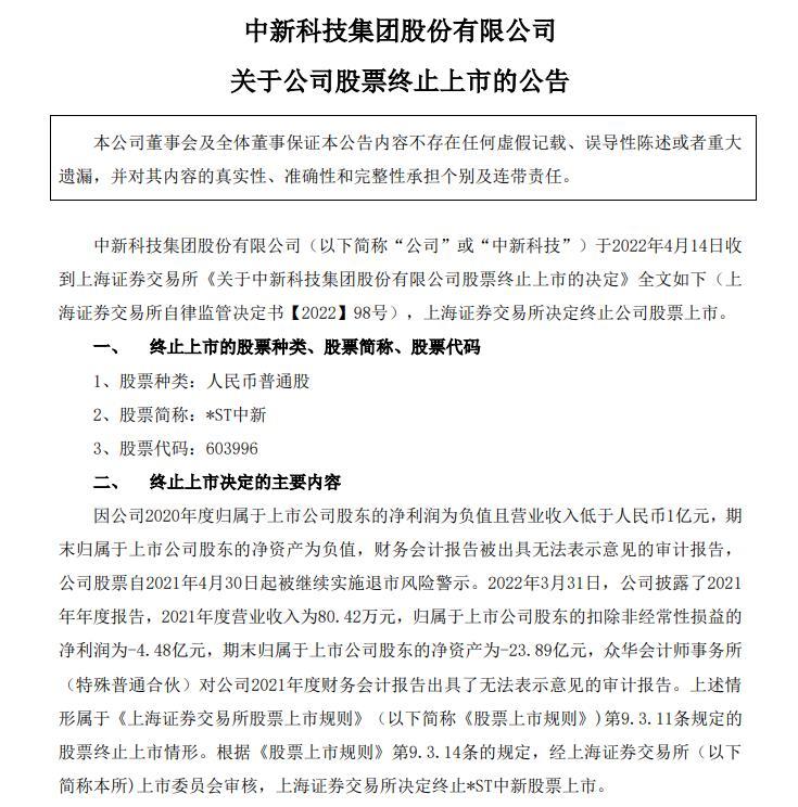 *ST中新表示,公司股票进入退市整理期交易的起始日为2022年4月22日,退市整理期为十五个交易日,如不考虑全天停牌因素,预计最后交易日期为2022年5月17日,如证券交易日期出现调整,公司退市整理期最后交易日期随之顺延。