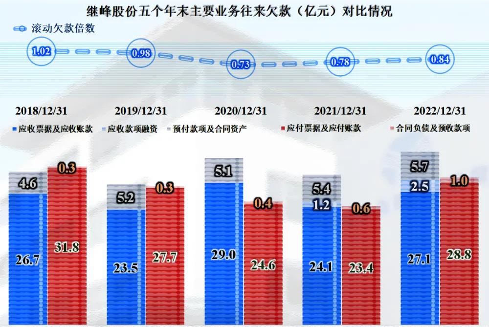汽配行业的供应链欠款比较严重,不过继峰股份四分之三的业务都在国外,其供应链上的欠款和被欠款在30亿元左右,和其营收规模比,金额并不是特别大,近几年变化也不大,没有明显增长的迹象。而且我们前面已经看过,他们的坏账情况也并不多。