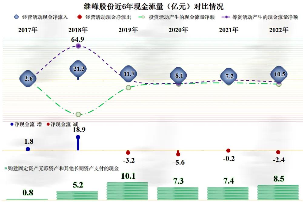 继峰股份的亏损主要来自于减值准备的计提,并不影响其现金流量,他们每一年经营活动的净现金流表现都是不错的,大多数时候也足够其固定资产类的投资需求,因此,最近四年以来,他们在净筹资和投资的规模上并不突出。