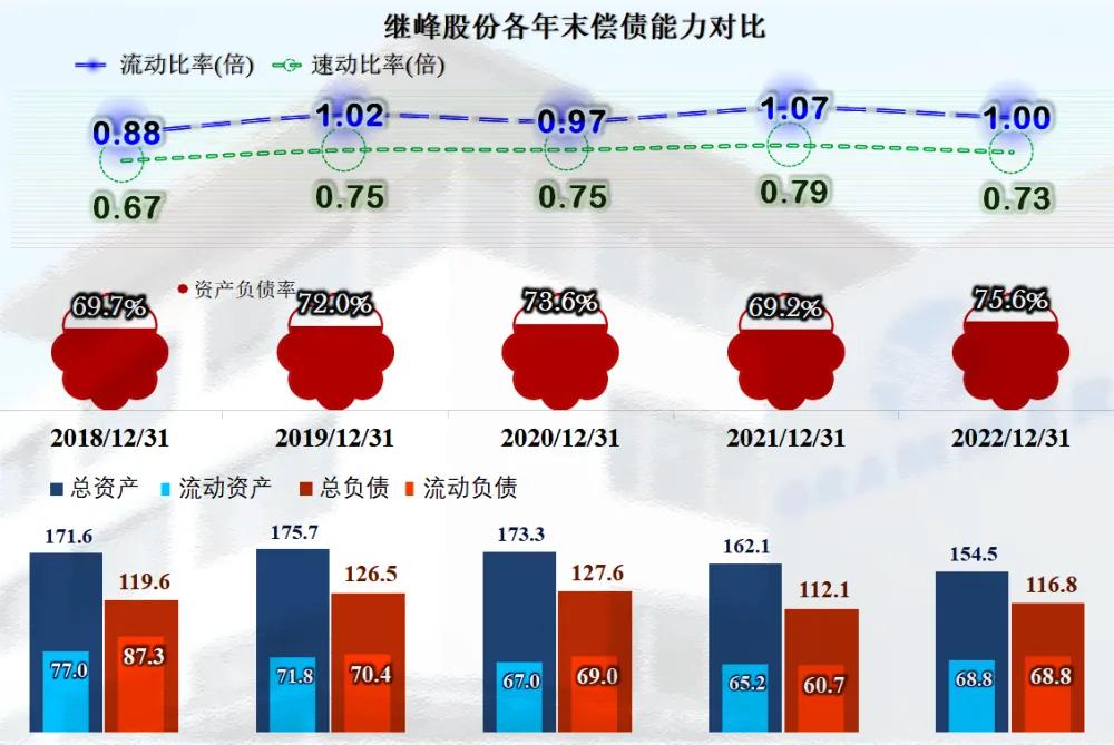 2022年末,继峰股份的资产负债率上升至了75.6%,1倍的流动比率和0.73倍的速动比率,其长短期偿债能力都不能算太强,我们有必要展开来看一下。