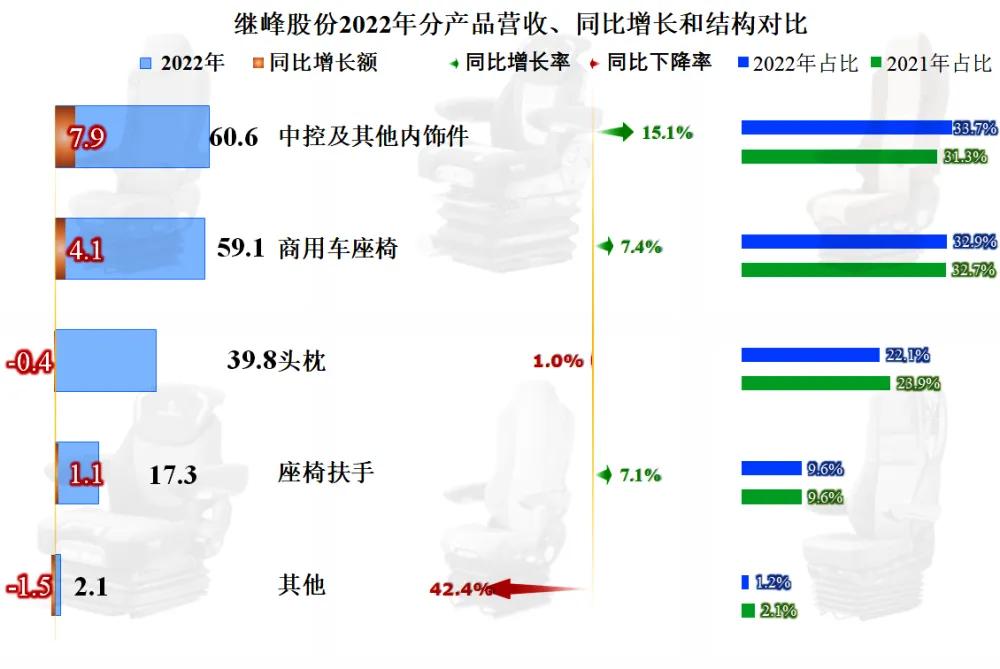 2021年还是最大业务的“商用车座椅”,2022年被“中控及其他内饰件”挤到第二位了,因为“中控及其他内饰件”的增长更快,而两大业务的体量差不多,都在60亿元左右,占比也都是三成多。“座椅扶手”业务的增长和座椅接近,只有第三大业务“头枕”的营收略有下降。