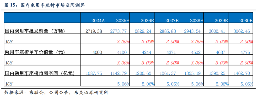 我们对国内乘用车座椅的市场空间进行了测算,核心假设如下: