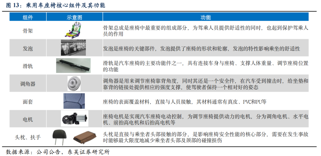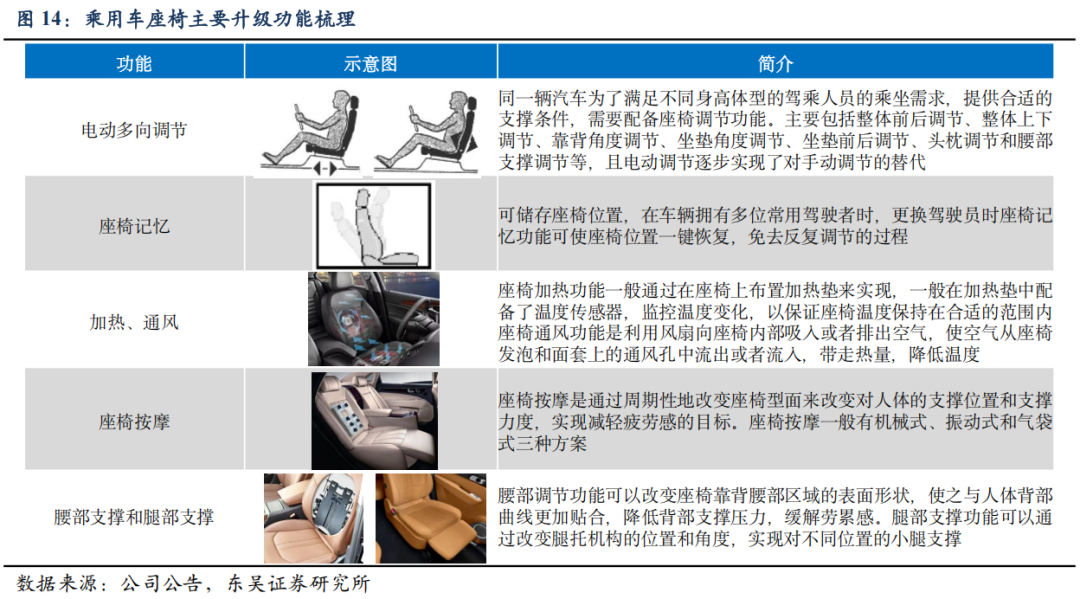 (2)当前乘用车座椅平均单车价值量为4000元,随着汽车消费升级的持续推进,座椅的舒适性功能渗透率持续提升,带来乘用车座椅单车价值量后续将持续提升;