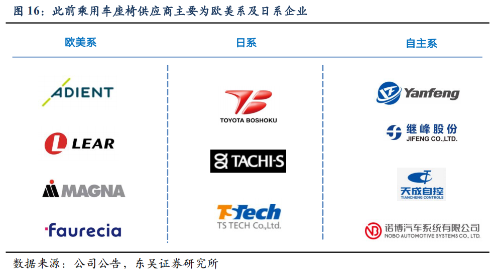 全球范围内来看,乘用车座椅供应商主要包括欧美系及日系企业,国内企业则包括延锋等。乘用车座椅作为整车中的核心部件,主机厂和座椅供应商的关系相对紧密,通常存在长期的信赖合作关系。分系别来看,欧美系通常采用独立经营的方式,主要企业包括安道拓、李尔、麦格纳和佛吉亚;日系则通常与主机厂存在持股关系,如丰田纺织(丰田持股)、提爱思(本田持股)、泰极爱思(日产和三菱曾经持股);内资座椅企业主要包括延锋国际座椅(上汽集团体系,前身为合资企业延锋安道拓)、诺博汽车(长城子公司)以及继峰股份和天成自控等持续扩展乘用车座椅业务的民营企业。
