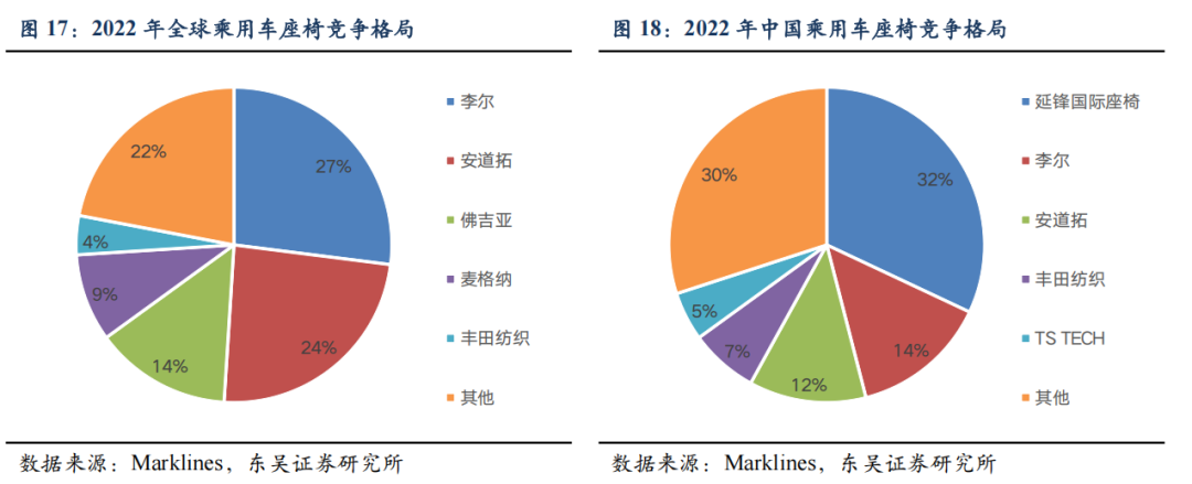 全球市场:从全球市场来看,李尔、安道拓、佛吉亚、麦格纳、丰田纺织占据行业主要份额,2022年市占率分别为27%、24%、14%、9%和4%。行业集中度方面,2022年全球乘用车座椅行业CR3为65%,CR5则高达78%,行业集中度非常高。