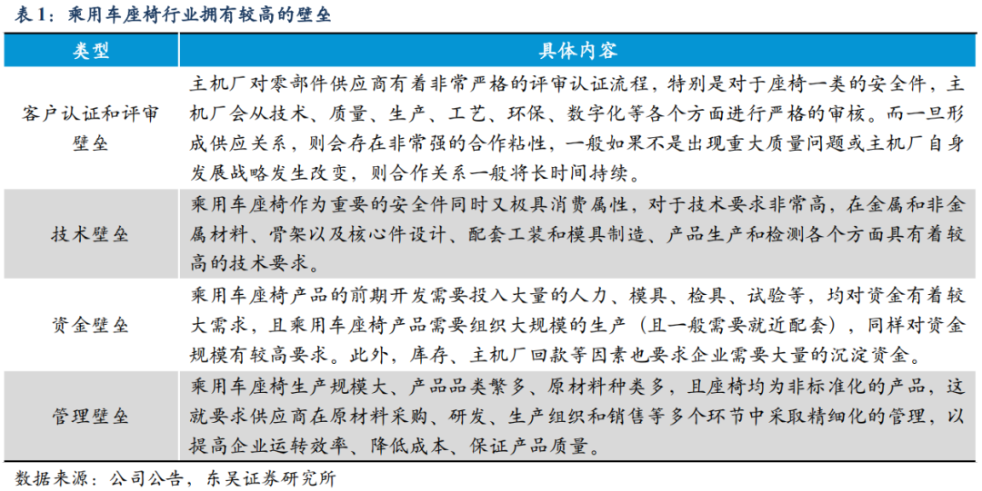 高壁垒塑造出乘用车座椅行业优秀的竞争格局