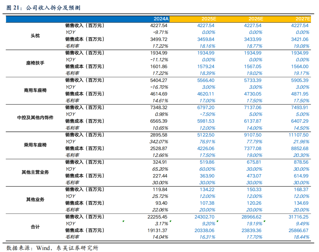 毛利率预测:随着公司乘用车座椅收入持续增长带来的规模效应以及内部持续降本增效措施效果的体现,预计公司乘用车座椅业务毛利率2025-2027年分别为17.50%/19.00%/20.30%。公司2025-2027年整体综合毛利率预计分别为16.31%/17.70%/18.44%。