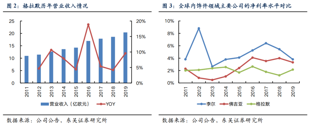 并购前格拉默净利率长期处于低位。从盈利端来看,格拉默的净利润水平较低,2011年至2019年长期保持在0.2-0.4亿欧元的水平;从净利率方面来看,格拉默净利率2011年至2019年长期保持在1.5%-2.0%的水平,远低于继峰并购前自身15%上下净利率。此外,我们还选取了业务相似的海外汽车内饰件行业的李尔和佛吉亚作为可比公司,同样可以发现格拉默的盈利能力要低于李尔与佛吉亚。