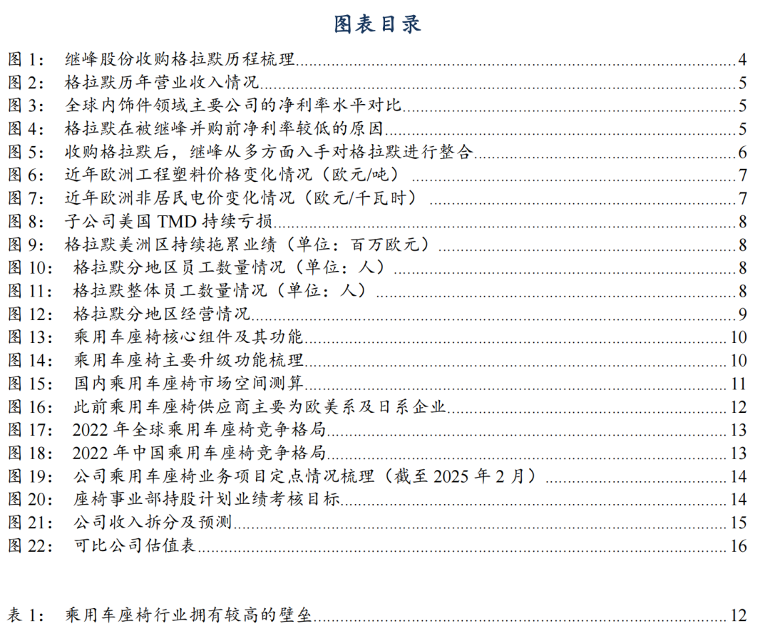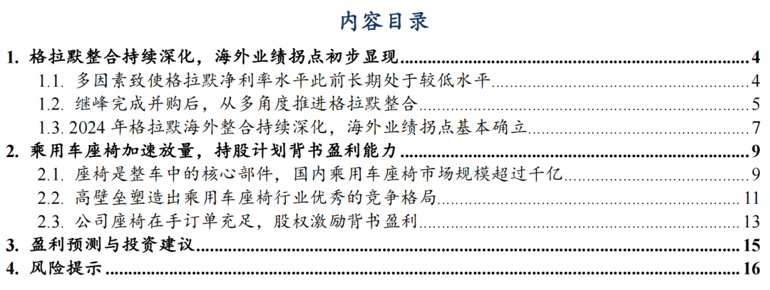 我们认为公司业绩拐点已经基本确立,后续业绩将呈现加速改善的趋势。格拉默海外业绩在整合深化的背景下开始改善;格拉默亚太区盈利能力历年保持稳健+营收持续增长;继峰本部传统头枕/扶手业务整体稳健+电动出风口等新业务持续拓展;乘用车座椅业务在员工持股计划的背书下2025-2026年业绩加速释放可期。