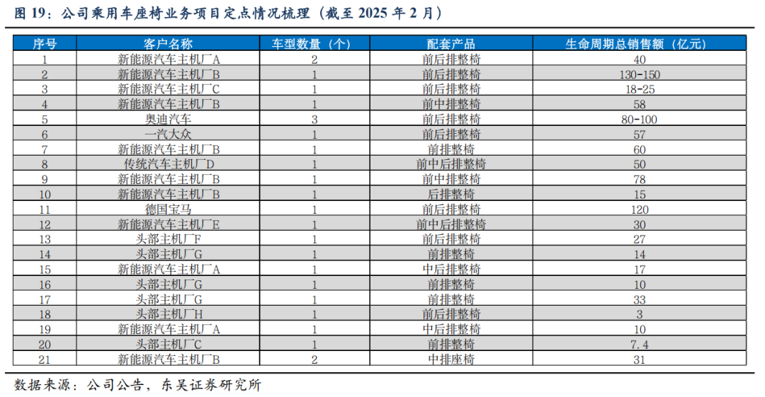 公司凭借着成本优势+快速响应+技术突破,持续获得高质量项目定点。目前,公司乘用车座椅客户已经覆盖蔚来、理想、奇瑞、吉利、长安、奥迪、宝马和一汽大众等头部主机厂。截至2025年2月,公司已获得的乘用车座椅在手项目定点共计21个,在手订单的不断积累,为公司乘用车座椅业务后续快速发展打下了坚实基础。