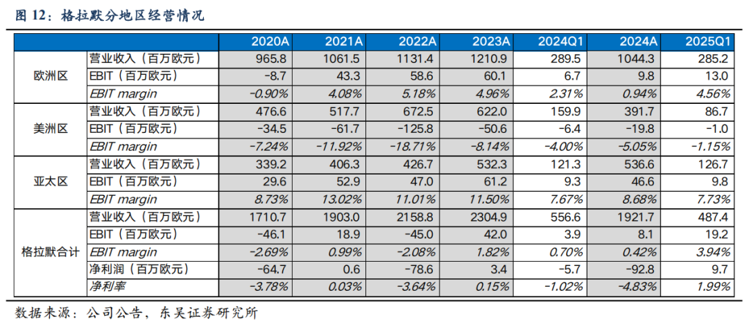 欧洲区:格拉默欧洲区2025Q1实现营收2.85亿欧元,同比微幅下滑;实现EBIT 1300万欧元,同比增长94%;实现EBIT margin 4.56%,同比提升2.25个百分点;