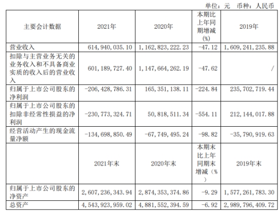 威奥股份2021年营业收入为6.15亿元,同比下降47.12%;归属于上市公司股东的净利润为-2.06亿元,上年同期为1.65亿元;归属于上市公司股东的扣除非经常性损益的净利润为-2.31亿元,上年同期为5081.85万元;经营活动产生的现金流量净额为-1.35亿元,上年同期为-6774.95万元。