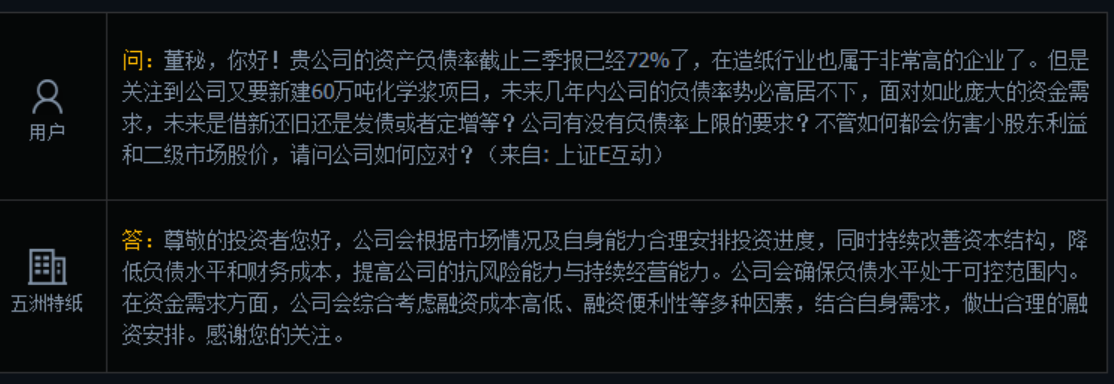 公开资料显示,五洲特纸主营业务为机制纸和纸浆的研发、生产和销售,是国内大型特种纸研发和生产企业之一。