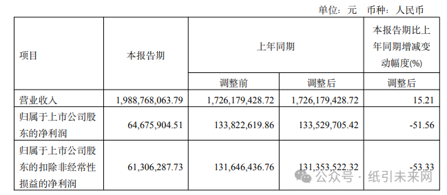 纸引未来网消息,4月14日,五洲特纸(605007)发布一季报,公司2025年第一季度实现营业收入19.89亿元,同比增长15.21%;归母净利润为6467.59万元,同比下降51.56%;扣非净利润为6130.63万元,同比下降53.33%。