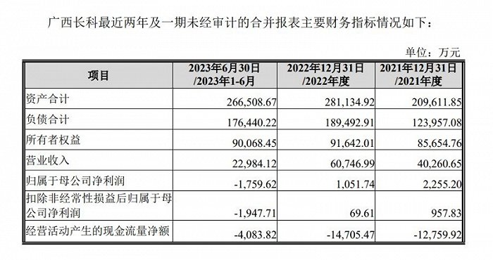 2023年6月30日,广西长科的总资产合计26.65亿元,所有者权益(净资产)为9.01亿元;2022年年末,其总资产为28.11亿元,净资产为9.16亿元。值得注意的是,广西长科在2022年度的归母净利润1051.74万元不足上年的一半,扣非归母净利润仅69.61万元;2023年上半年归母净利润出现1759.62万元的亏损,扣非归母净利润为亏损1947.71万元。