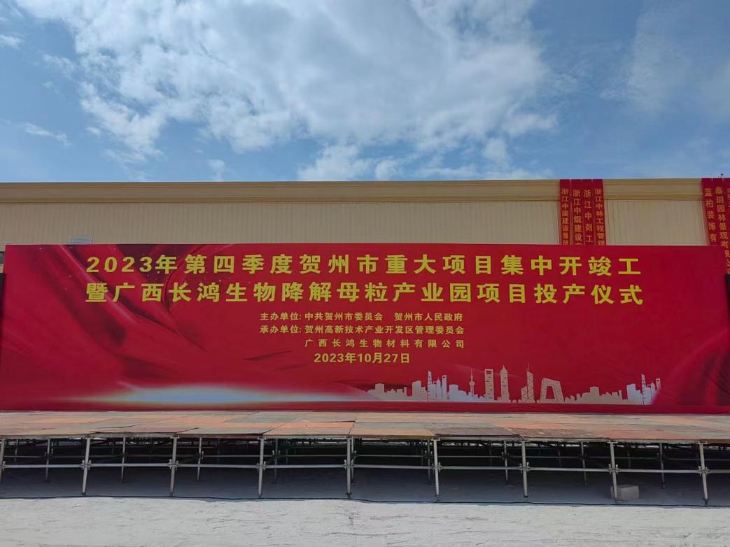10月27日,2023年第四季度贺州市重大项目集中开竣工暨广西长鸿生物降解母粒产业园项目投产仪式举行,由宁波长鸿高分子科技股份有限公司(简称:长鸿高科)投资,总金额达30亿元的“长鸿生物降解母粒产业园项目”正式投产。