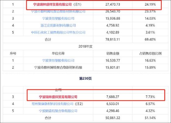 值得注意的是,宁波瑞林盛祥贸易有限公司由2018年的第三大客户跃升为2019年第一大客户,销售额由76688.27万元飙升至2.75亿元,收入占比由7.73%飙涨至24.19%。