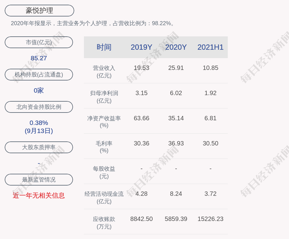 2020年年报显示,豪悦护理的主营业务为个人护理,占营收比例为:98.22%。