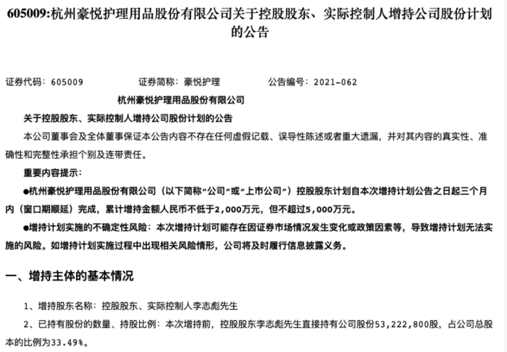 与此同时,豪悦护理控股股东、实际控制人李志彪表示,拟3个月内增持2000万元-5000万元股票。