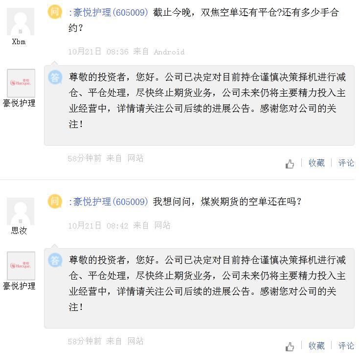 10月24日,豪悦护理回复上交所监管工作函称,对由期货投资产生的亏损深表歉意,决定有序终止期货投资,对目前持仓谨慎决策择机进行减仓、平仓处理,尽快终止期货业务,注销期货账户,公司未来仍将主要精力投入主业经营中。公司对主要责任人进行警告和降薪处理。