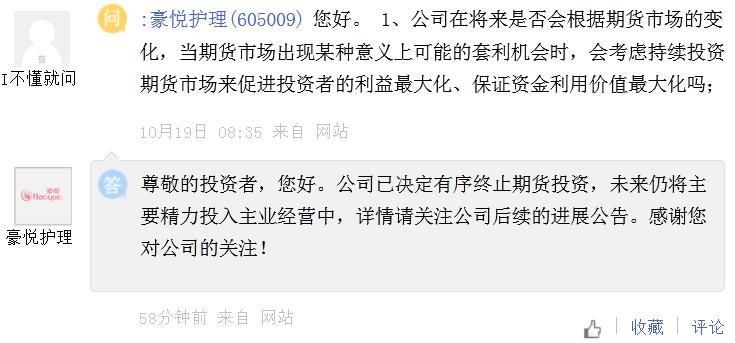 对于上述提问,豪悦护理回应称,已决定对目前持仓谨慎决策择机进行减仓、平仓处理,尽快终止期货业务,公司未来仍将主要精力投入主业经营中。