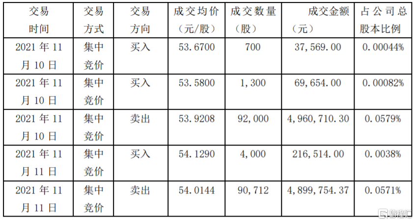 瓯泰投资于2021年11月10日卖出公司股票92,000股,成交均价53.9208元/股,买入公司股票2,000股,成交均价为53.6115元/股,产生收益为618.6元;2021年11月11日卖出公司股票90,712股,成交均价54.0144元/股,买入公司股票4,000股,成交均价为54.1290元/股,产生亏损为458.4元。